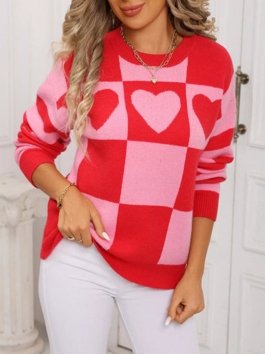 Heart Pattern Checkerboard Knit Sweater